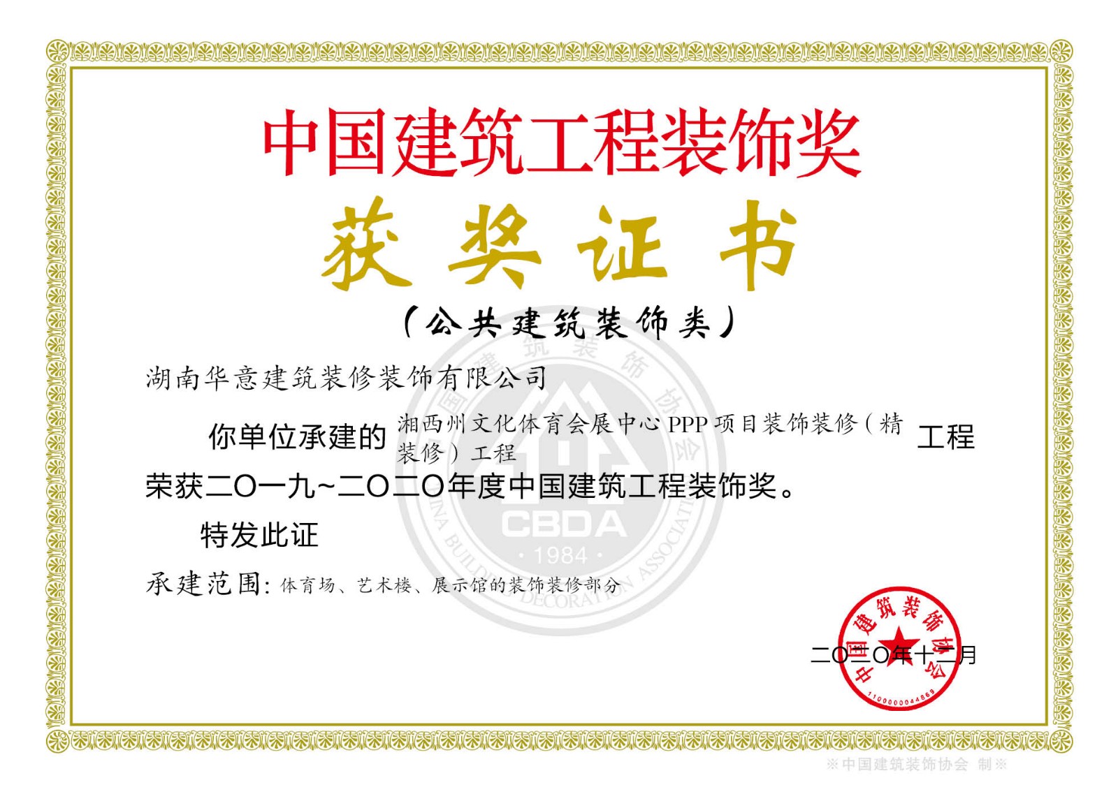 裝飾獎--湘西州文化體育會展中心PPP項目裝飾裝修(精裝修)工程