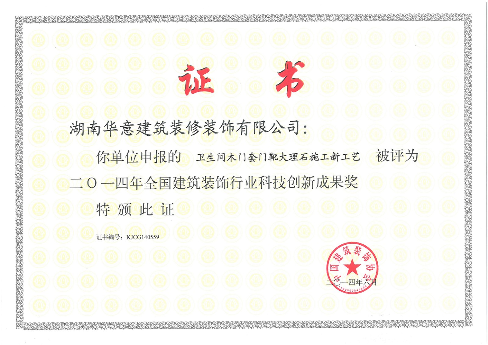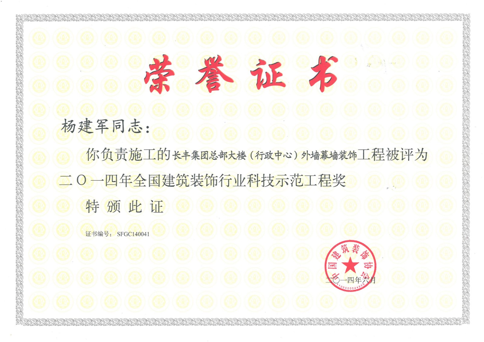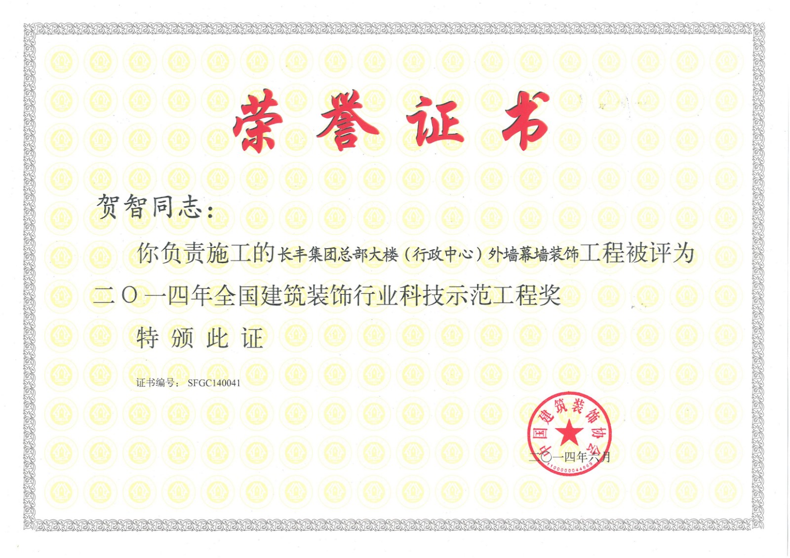 行業科技示范工程榮譽證書